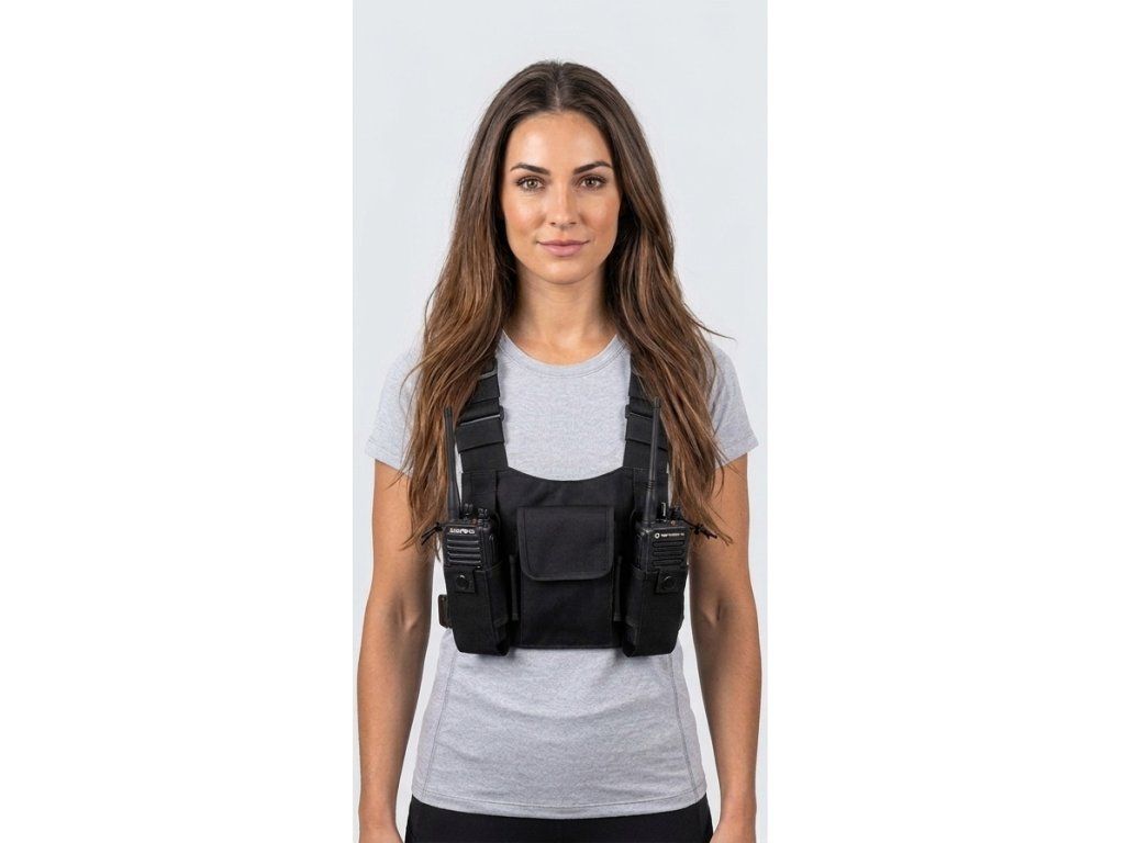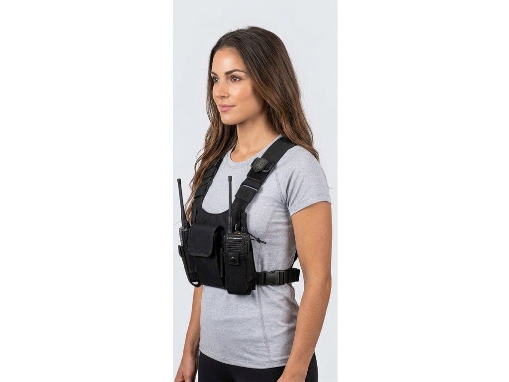 Lehké nylonové hrudní pouzdro P4 s popruhem přes obě ramena určené pro ochranu až dvou ručních radiostanic, uzavíratelná kapsa na suchý zip. Pouzdro je vybaveno nastavitelným popruhem ve vertikálním i horizontálním směru. Radiostanice jsou v pouzdru zajištěna nastavitelným páskem. Ramenní popruhy mají flexibilní pásky pro snadné vedení kabelu drátové komunikační soupravě.